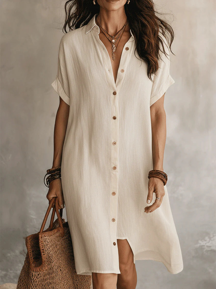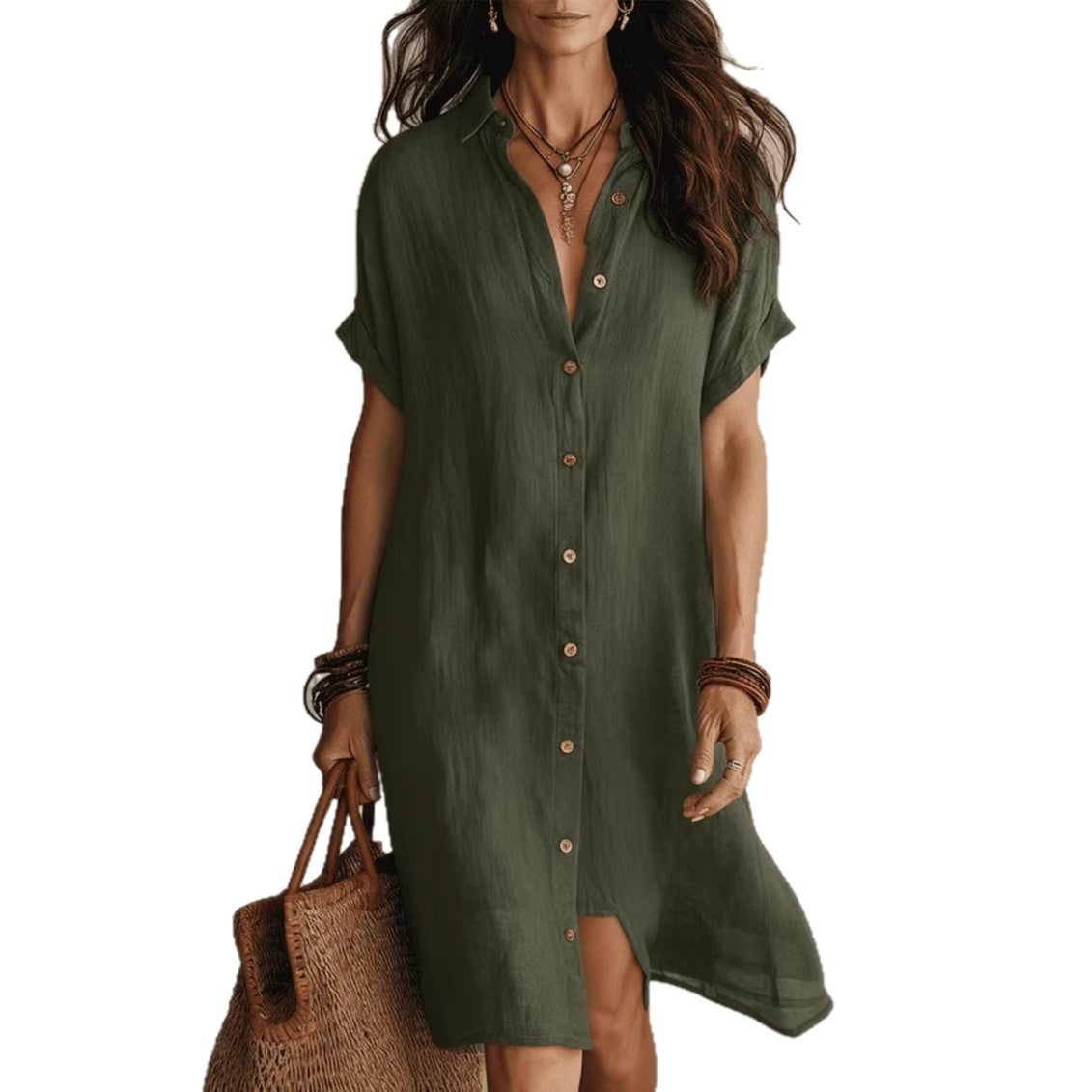 Buttoned Short-Sleeve Linen Midi Shirt Dress
